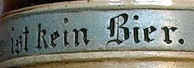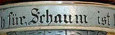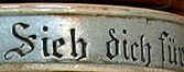 This is something like "Don't judge a book by its cover." on an etched stein probably by J. W. Remy ca. 1900. Sometimes the first line is seen with a variant phrase "Sicher dich'' which has the same meaning. | |