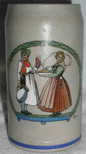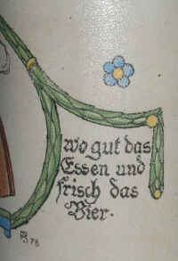 This self explanatory verse appears on a Jugendstil (youth style = modern art) stein without lid marked with the logo of S. P. Gerz and designed by Franz Ringer (#78), ca. early 1900's. | |