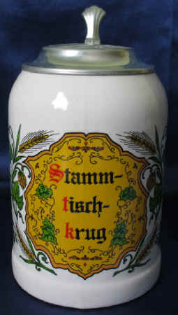 This modern stein is made for a beer drinker that would come in regularly to a pub and sit at the same table with his/her friends every day, ca. 2000. Note how three words are put together to form one in German. | |