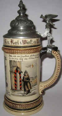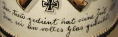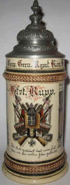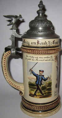 This reservist's stein was purchased by Gefreiter ((lance-corporal) Rupp in remembrance of his service time 1896 - 1898 in the Grenadier (Infantry) Regt. "King Karl" (5 Württemberg) Nr. 123 Ulm, ca. 1898. These three verses are self explanatory. | |
