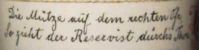 Steh ich in finstrer Mitternacht, so einsam auf der stillen Wacht. Die Mütze auf dem rechten Ofr, so zieht der Reservist durch's Thor. Der treu gedient hat seine Zeit, dem sei ein volles Glas geweiht. |