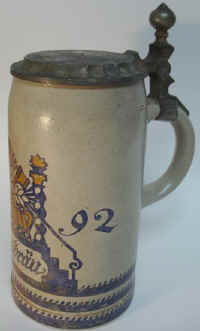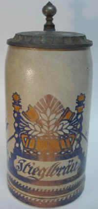 This is a very nice brewery stein for a classical brewery in Saltzburg, Austria founded in 1492 and named for a staircase in the local Palace. The decoration shows the staircases on the sides and brewers' vat and tools on the front of this Jugendstil (youth style = modern art) stein marked Merkelbach & Wick ca. early 1900's. | |