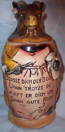 Watch out for the Bock Beer because it has a kick. This is a character stein in the form of Billy Goat which represents Bock Beer marked "Made in Germany Western 837" ca. post WWII. | |