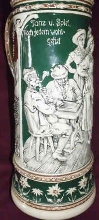 | One can't argue with this truism on a large relief stein marked only "754", ca. 1900. | |