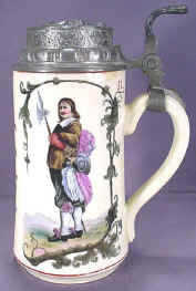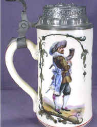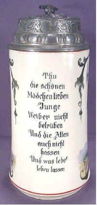 This is a porcelain stein with a lithophane (picture in the bottom that can be viewed when the stein is held up to a light) made ca. 1900. Note on cognates: Old German "th" converts to "t" and sometimes "d". Thus the first word "thu" becomes "tu" which in English is "do", all of which have very similar sounds. This sequence can also be reversed as in the German "die" becomes English "the" which both have the long "e" sound. Similarly the German "du" is the cognate of the old English "thou". The verse is an old German proverb that rhymes. | |