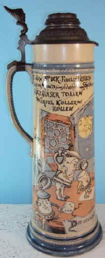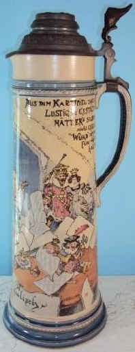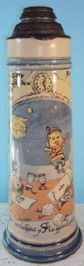 This is a whimsical and imaginary scene of what might be happening at a local gathering of friends (Men's night out at the Club with no one present) as set forth by Heinrich Schlitt on this large PUG (printed under glaze) pouring stein marked with the Mettlach logo and mold number 2488 ca. 1900. | |
