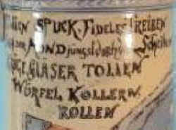 A comical apparition, merrily set in motion saw the new moon thru the window, steins, glasses, comical dice in a frenzied roll. With the card playing, merry dancing started, there was no one (around) to be seen, and it would not have been possible to constrain. The composed regular meeting of friends |