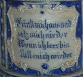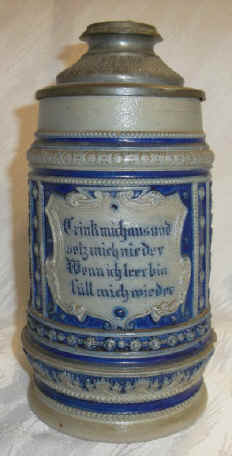 | This is a quaint and practical verse on a probable Reinhold Merkelbach salt-glazed stein with base impressed "589" ca. last quarter of the 1800's. | |