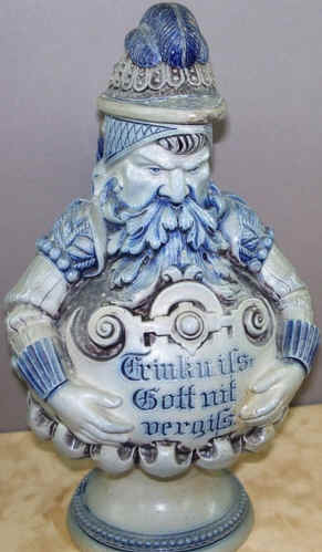 | These are words to live by on this blue/gray, salt-glazed, stoneware, character stein of a knight marked with the Merkelbach & Wick logo, ca. 1900. | |