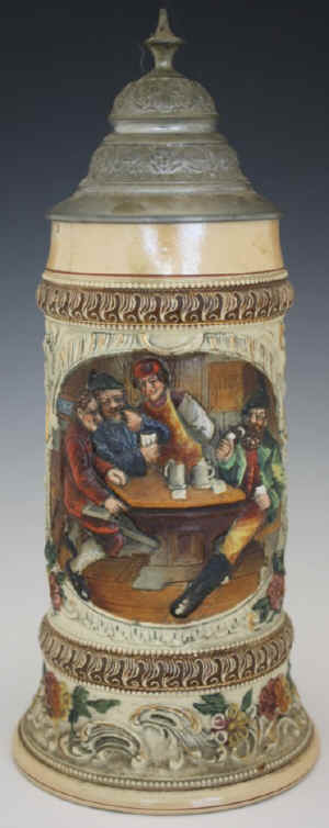 The message here is to drink regardless of the circumstances. This is a fancy relief stein marked only "Germany W" (not to be confused with West Germany) ca. 1900. | |