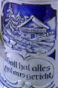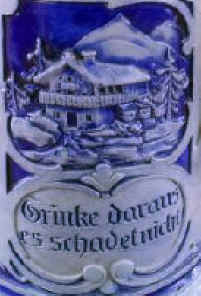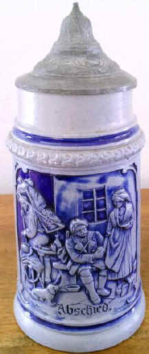| Another good reason to drink up on this blue/gray, stoneware, salt-glazed stein with a scene labeled Abschied (departure). The stein is marked "Germany 201 62", ca. 1900. | |