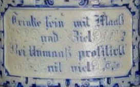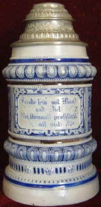 The rhyming message here is to drink in moderation, but if you can't control it, keep your mouth shut and don't complain. The blue/gray, salt-glazed, stoneware stein is marked only "309", ca. late 1800's. | |