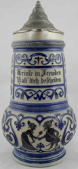 The verse means to drink to your heart's content, but not too much on this large, salt-glazed, stoneware, pouring stein probably made by Dümler & Breiden, but marked only "168", ca. 1900. | |