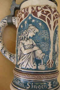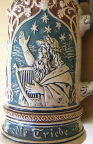 Who can argue with the theme on this relief stein probably by Dümler & Breiden marked only "516" ca. 1900. | |