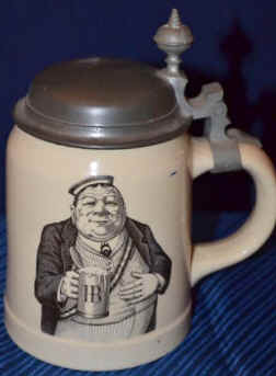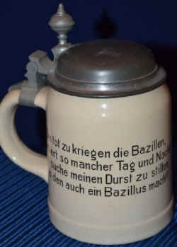 | The verse seems to go along with the scene of a (biology) student whose fretting about being done in by bacteria, but he can't help making them in his digestive track when he quenches his thirst with beer. The stein is marked with the Mettlach logo, form number 1526 and decor number 7200, ca. 1900. | |