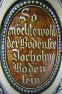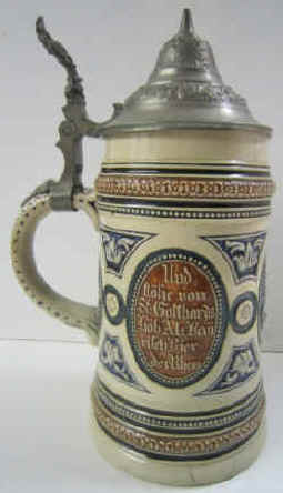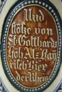 | The verse seems to indicate that the Bavarian beer from St. Gotthard Pass flows without end. The stein, ca. 1900, is marked with the Reinhold Merkelbach logo and "298 K". | |