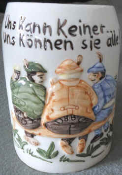 The stein without lid was probably made by the Sitzendorf Porzellanfabrik, ca. after WWII. The verse on this stein expounds the typical Bavarian attitudes -- we (do/know) what we want, leave us alone, we don't care. In English, we would most likely phrase the second line as "Everyone can kiss our ....". | |