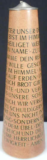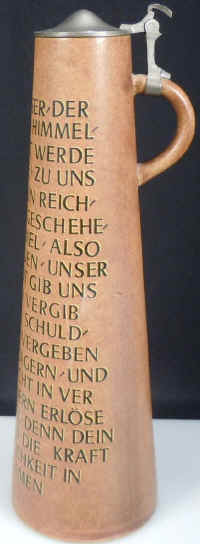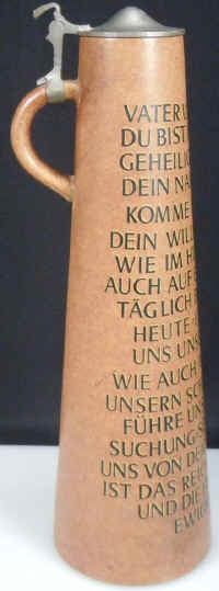 This is the way I learned the Lord's Prayer in English when I was a youngster and you can see all of the cognates in the German version. The cone-shaped stein is marked with the logo of Werner Corzelius and "1101 Germany", ca. post WW II. | |