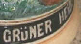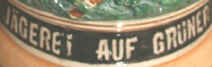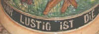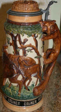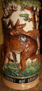 The scene shows deer being startled by the sudden approach of a storm. The second verse goes with the general hunting theme on this heavy relief stein, ca. 1900. | |