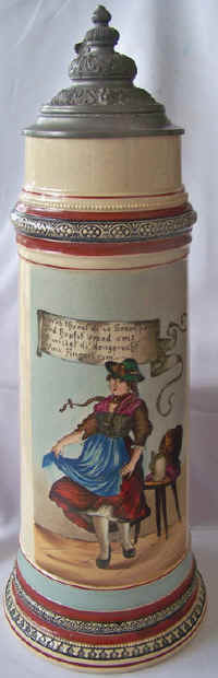 This verse is in Bayerisch (Bavarian dialect) and shows a young Bavarian girl head over heels for some guy and her activities are designed to sweep him off of his feet on this 2 L. PUG (printed under glaze) stein marked with the Marzi & Remy logo and "Made in Germany 1138" ca. 1900. | |