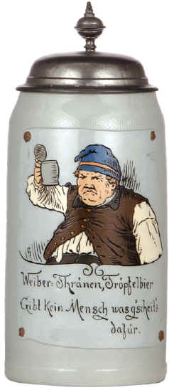 This is a poetic translation and you can see the frustration on this drinker's face. This "Tapestry" stein is marked with the Mettlach logo and form number 1647, ca. 1900. | |