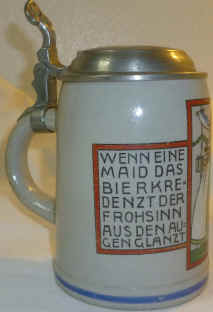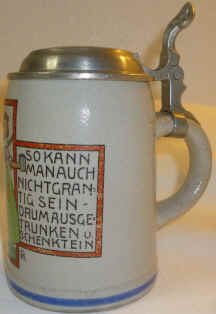 The message is self evident on this Jugendstil (youth style = modern art) stein designed by Franz Ringer and marked with the Marzi & Remy logo and "650", ca. early 1900's. | |