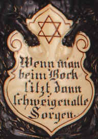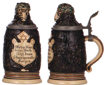 This is a character stein of a sitting ram representing bock beer marked with the Merkelbach & Wick logo, ca. 1900. The hexagram is the Brauerstern (brewer's star) or beer symbol and not the Star of David in this case. | |