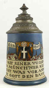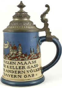 | This is a 1/2 L etched Mettlach stein #2002 made in the 1890s. It shows the roof tops of the city of Munich and the Münchener Kindl (Munich Child) symbol of the city. This stein was designed by Otto Hupp with the verse to honor the Bavarians and their capitol city. Note that this has the original fancy pewter lid which was more expensive than the plain pewter lid which was more expensive than the ceramic inlaid lid. However collectors now usually prefer the inlaid lids. | |