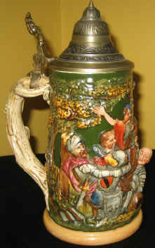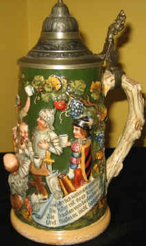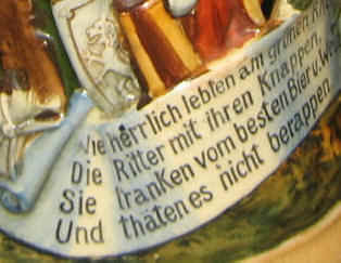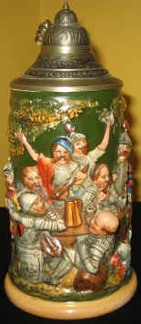 | Those were the carefree days for the knights and their squires as depicted on this heavy relief stein marked "Germany 1400" ca. early 1900's. | |