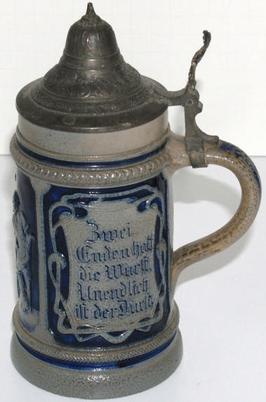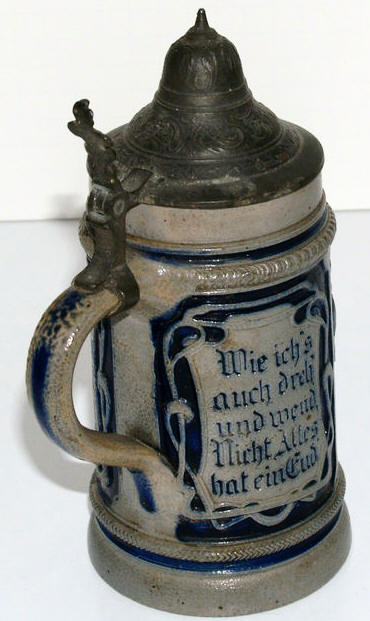 An interesting ditty on this cute little blue/gray stoneware stein ca. 1900. | |
