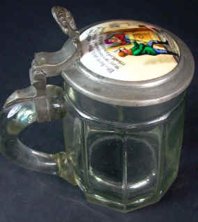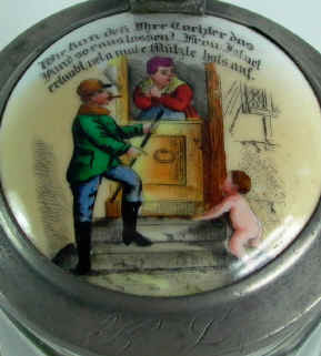 Here's a bit of local humor in dialect on the porcelain lid of this glass stein ca. prior to 1880. Before about 1880 the handles on glass steins were placed first to the upper end where the glass is larger and then brought around to the lower attachment which is smaller. In the late 1900's it was found to be more structurally sound to do the reverse. It is interesting to note that "Frou" is a woman's name in Bavarian dialect and not associated with the word "Frau" (woman) in High German. | |