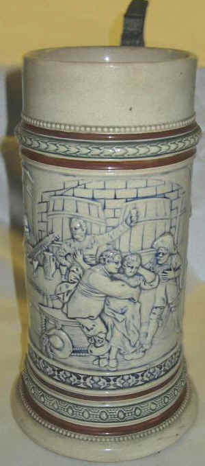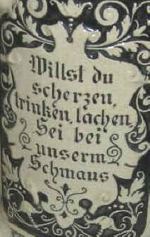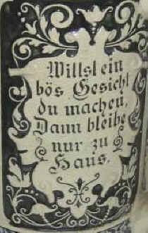 | If you're a deadbeat, stay home, but if you're a party animal, come join the party is the obvious meaning of this verse. The stein missing the lid is marked "788" and made by Reinhold Hanke, ca. 1900. | |