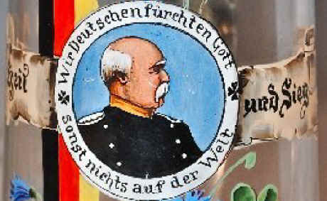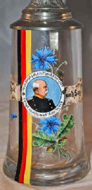 | These are famous quotes of Otto von Bismarck (1815-1898) who was General Field Marshall for Prussia in the "Franco Prussian War" that unified and formed Germany in 1871. The second phrase was much later turned around and used by Adolph Hitler as "Sieg Heil" (Hail Victory). This impressive glass stein is from about 1900. | |