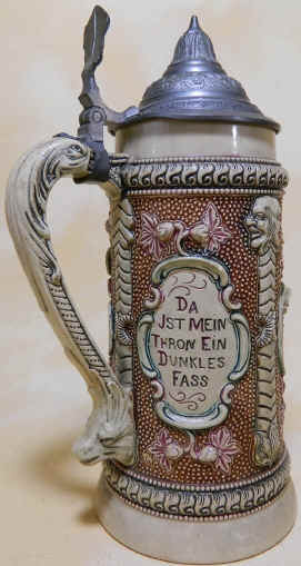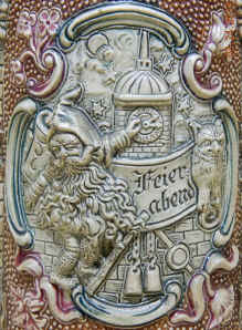 | Here is a self explanatory verse on a stein characteristic of Adolph Diesinger manufactory, ca. 1900. The gnome on the front scene is turning back the clock on this Feier Abend (fair = celebration evening). | |