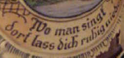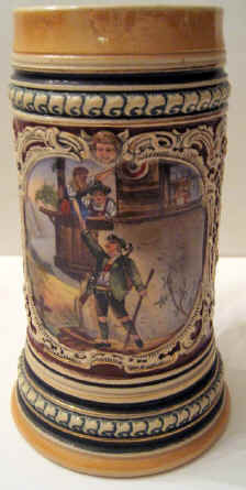 | People need singing in their lives is represented on this light relief stein marked with the Thewalt logo and "187 F" ca. 1895. | |