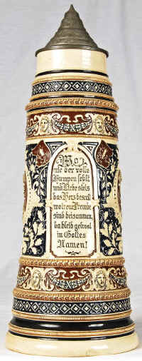 Here is a self-explanatory verse on this large 5-liter stein by J. W. Remy marked with the mold number 549, ca. 1900. | |