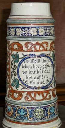 Actually drinking this 2 liter stein (without lid) to the bottom would probably put you to the ground. The stein is light relief stoneware ca. 1900. | |