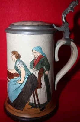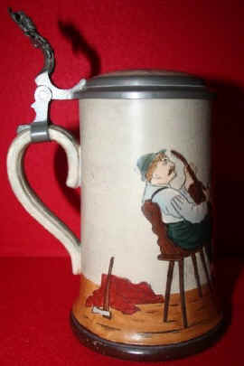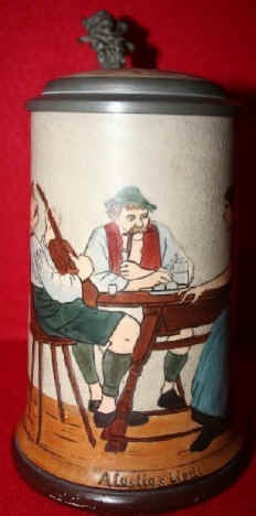 This etched stein, ca. late 1800's, by J.W. Remy, mold# 730, has a scene of merriment and a verse in Bayrisch (Bavarian dialect) to go along with it. | |