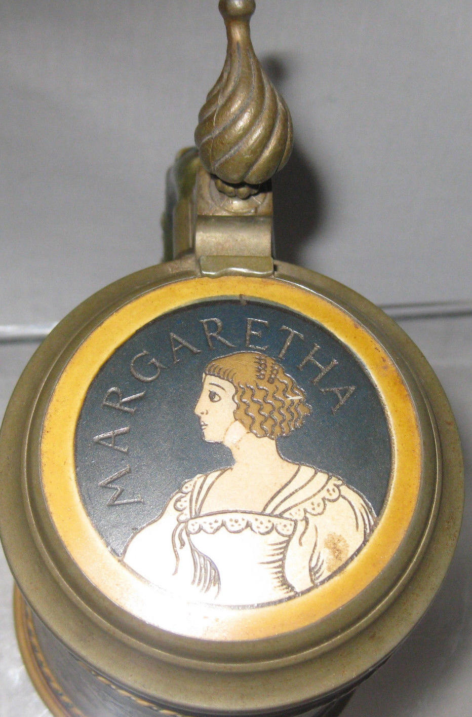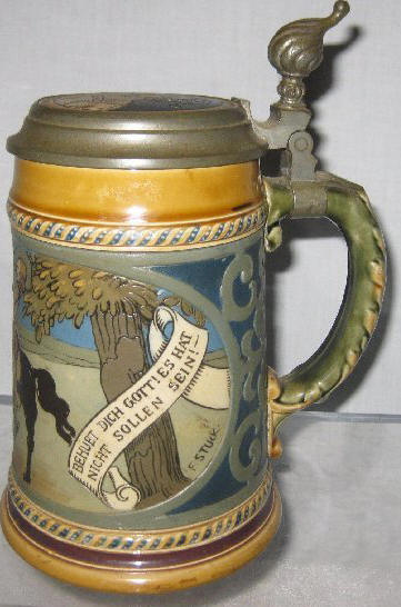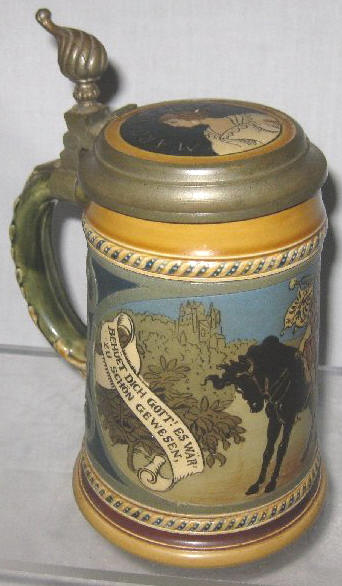 | This etched Mettlach stein, mold# 2008, portrays Josef Viktor von Scheffel's 1853 poem "Der Trompeter von Säckingen" (The trumpeter of Säckingen), a love story about Werner, the trumpeter,and Margaretha, a baron's daughter. Margaretha is shown in the inlay. See also translation: Behüt dich Gott. | |