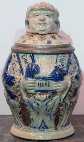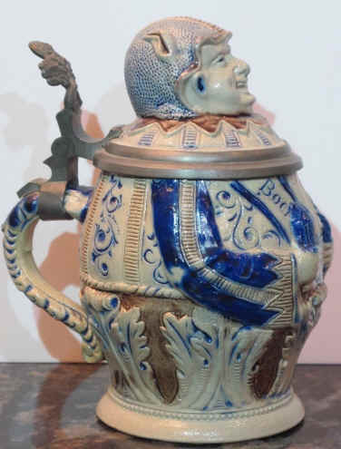 This is a nice blue-gray, salt glazed character stein of what looks like a