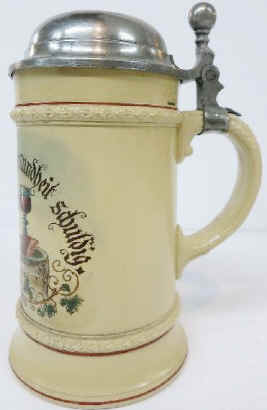 | The verse on this stein is completed by the imagery on the stein. It attributes good health to eating well and drinking the best beer and wine. The stein is marked "VB" (Villeroy & Boch), mold #406, and dated 1892. The stein was decorated by Friedrich van Hauten & Springmann of Bonn. | |