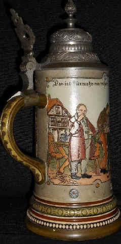 This etched Hauber & Reuther stein marked HR 437 Germany is a proud German bowler's stein. The German game is called Kegeln (or Skittles) and uses only 9 pins as opposed to our 10 pin bowling. See following translations: Alle neun, All' neun und Kranz beim Kegelspiel, and Alle neun beim Kegelspiel | |