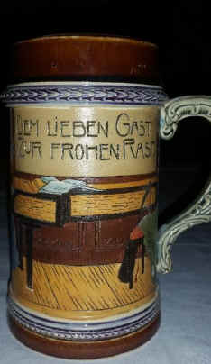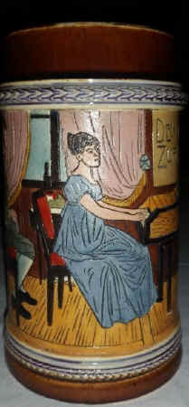 This etched JW Remy, mold # 1335, stein (without lid) is showing a hostess at an inn entertaining a guest to make him comfortable for his stay. | |