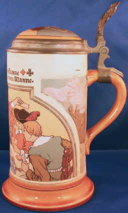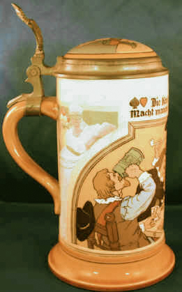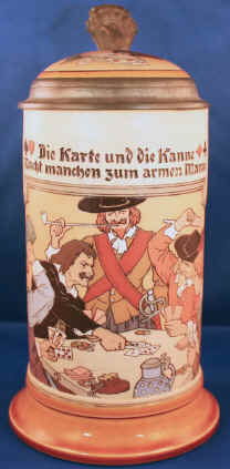 The message is clear in this typical gambling and drinking scene on this etched Mettlach stein #3329 dated 1910. | |