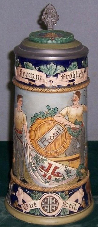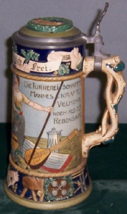 The verse on this J.W. Remy relief stein marked "Germany 1452" seems to be saying that the strength one gets from gymnastics is much more than what one gets from drinking wine. More information on the Turners (gymnasts) can be found in the translations of the other German words on this stein -- Gut Heil; Frisch, From, Fröhlich und Frei and the salutation: Prosit. | |