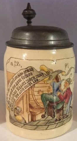 The amusing scene depicted on this stein shows two gnomes trying to drink at the same time from one tap on the beer barrel. The stein was made by Mettalch, mold #1526/601 ca. the 1890's. | |