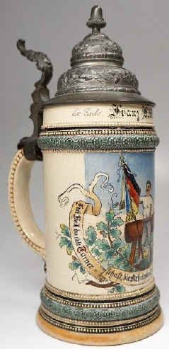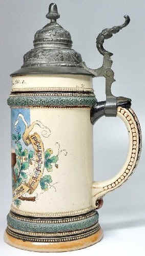 This is a very nice "gymnast's" stein named to Franz Kobler and made ca. late 1800's probably by Marzi and Remy. It has elements of the 19th C. German worker's movement. The precise translation of "Frei Heil" is difficult in English, but "Hail Freedom" catches the meaning as well as anything. | |