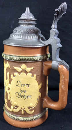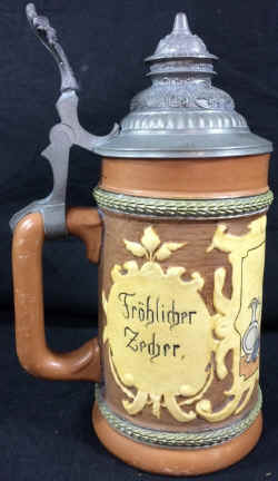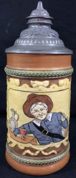 | Seems like a truism on this porcelain, tapestry stein marked HR (Hauber & Reuther) Germany # 217, ca. 1900. | |