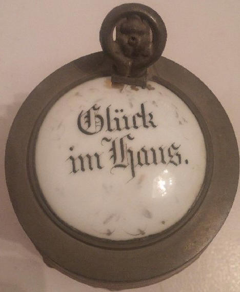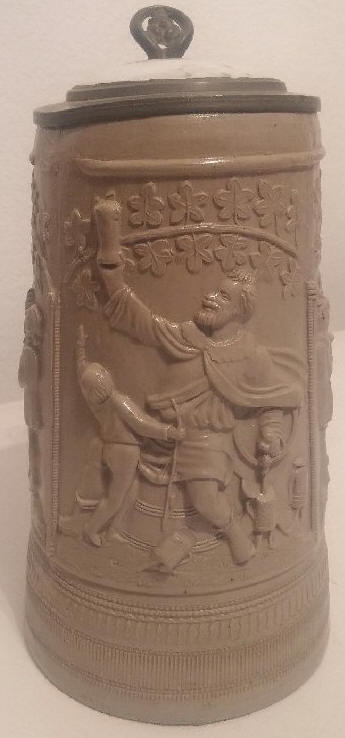 | The saying here is like a toast meaning "Let there be fortune and prosperity in your home." This type of relief stein is usually referred to as "Regensburg style", but were also made in "Höhr-Grenzhausen". The scenes were mostly direct copies from other makers like Mettlach. The side scenes on this stein were the same and were copied from Mettlach stein #202 designed by Ludwig Foltz II and the stein dates to the late 1800's. | |