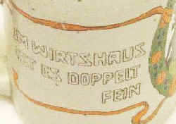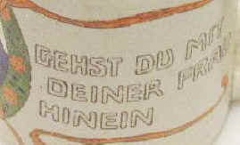 This Mettlach Bavaria atein #3232 decor 536, ca. (19)09, is showing you how to make your wife happy and have a few drinks at the same time. Proverbially it's known as killing two birds with one stone. | |